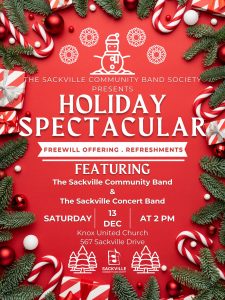 Join us for some holiday cheer! Holiday Spectacular is an afternoon of festive music featuring both The Sackville Community Band and the Sackville Concert Band. There will be freewill donations at the door as well as refreshments available. This concert will be live streamed on the Community Band Facebook Page